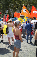 Was ist zu sehen? viel Grün, Piratenfahnen, natürlich die Linke, Attac und diverse Einzelplakate frisch aus dem Drucker oder Handarbeit.